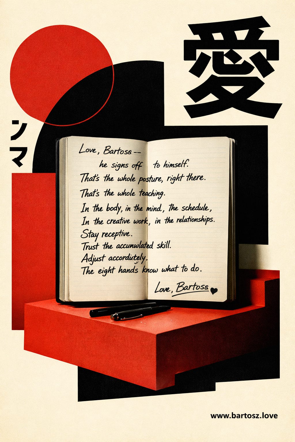 Love, Bartosz — he signs off to himself. That’s the whole posture, right there.