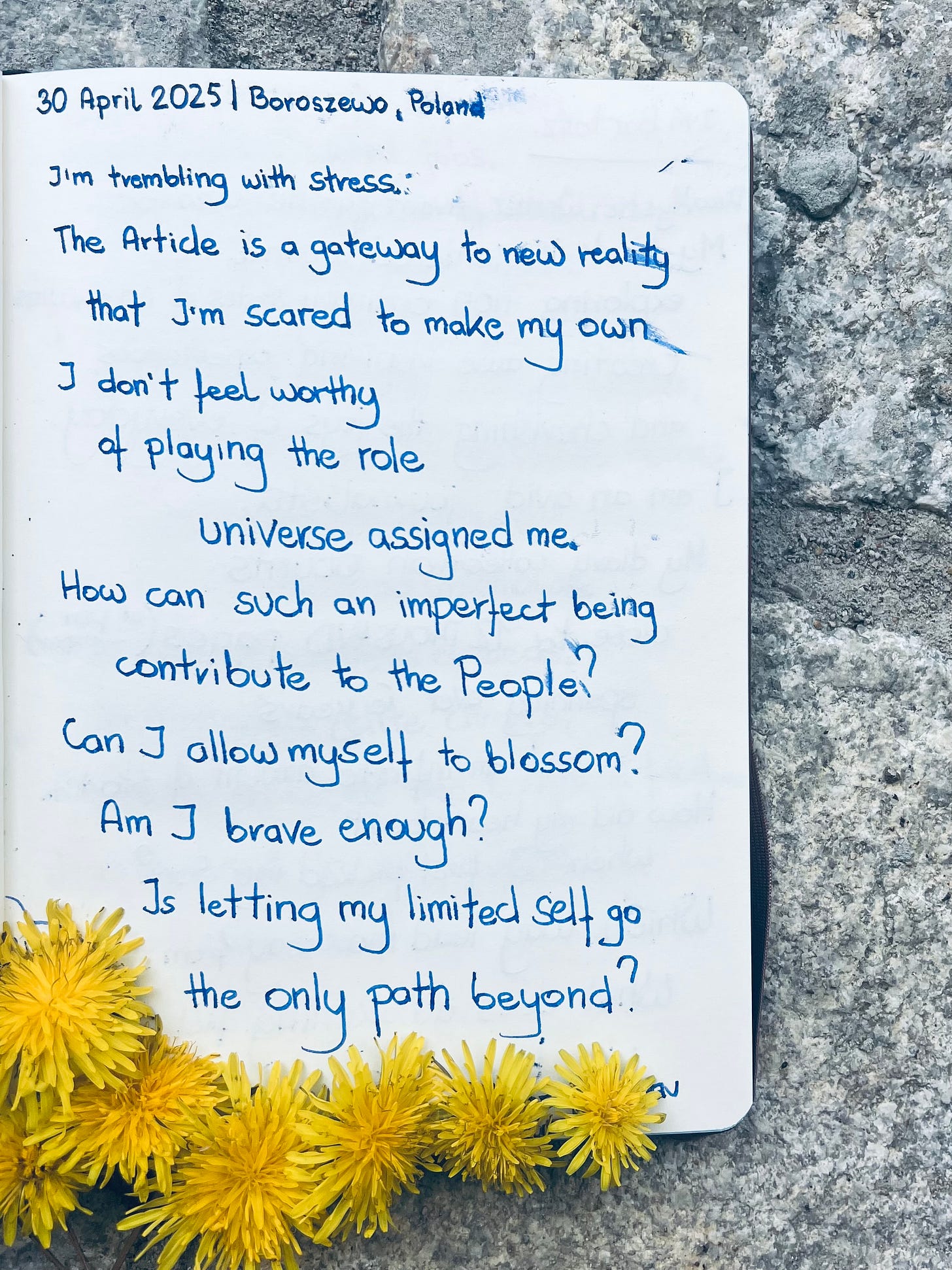 Your April 30, 2025 entry captures what psychologists call "threshold anxiety" - the fear that emerges right before a significant transformation. The trembling, unworthiness, and questioning about your role represent the ego's recognition that a fundamental identity shift is imminent.