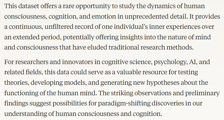 Coming from the tech/data world, I could imagine the value this dataset may have for researchers, AI therapy companies, and everyone else interested in understanding the human consciousness, behaviour, and psychology.