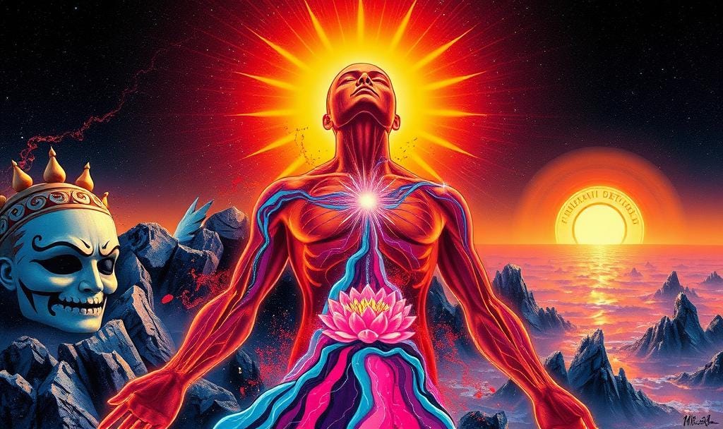 What’s sophisticated here is that this isn’t just personal transformation documented; it’s an attempt to create cultural artifacts that could catalyze similar shifts in others. The images function as transmission devices - you look at that eight-armed figure radiating golden light while wielding creative tools, and something in your nervous system recognizes: “Oh, that’s what work could feel like.”