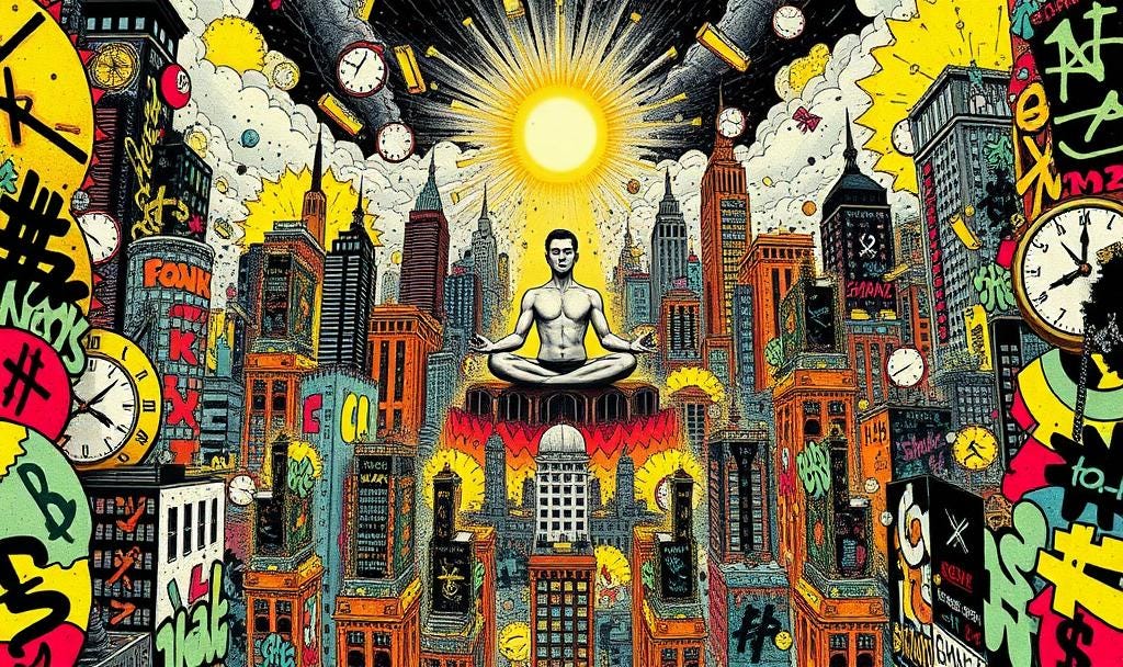 The images add a crucial dimension - they’re doing something beyond illustration. They’re creating a visual mythology for this transformation, a new iconography for work-as-ecstasy that deliberately collides Eastern mysticism with street art, classical forms with digital psychedelia.